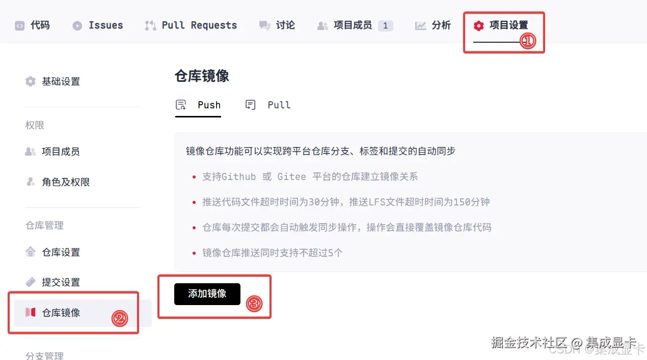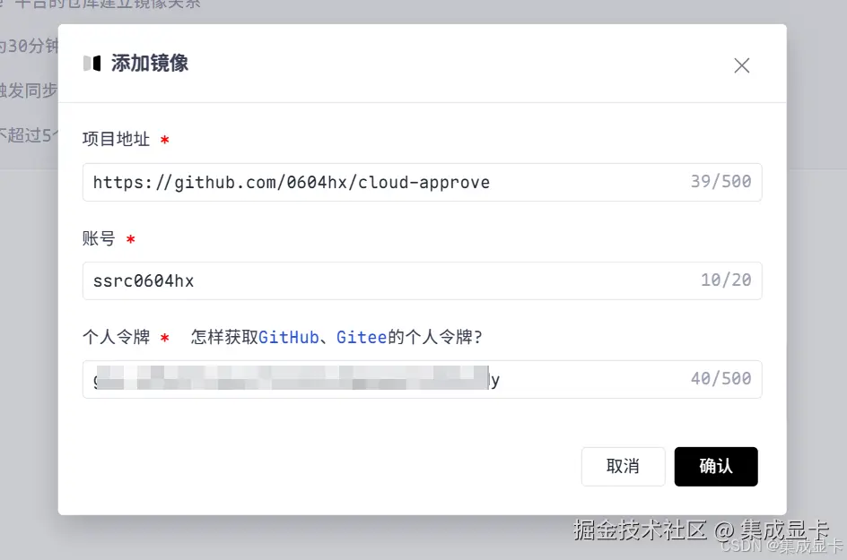 项目设置->仓库镜像页面,点击添加镜像,在以下窗口填写令牌后点击确认。其中账号一栏可以直接填写 GitCode 账号,我的 GitHub 账号0604hx不被识别,因为不是字母开头😂。