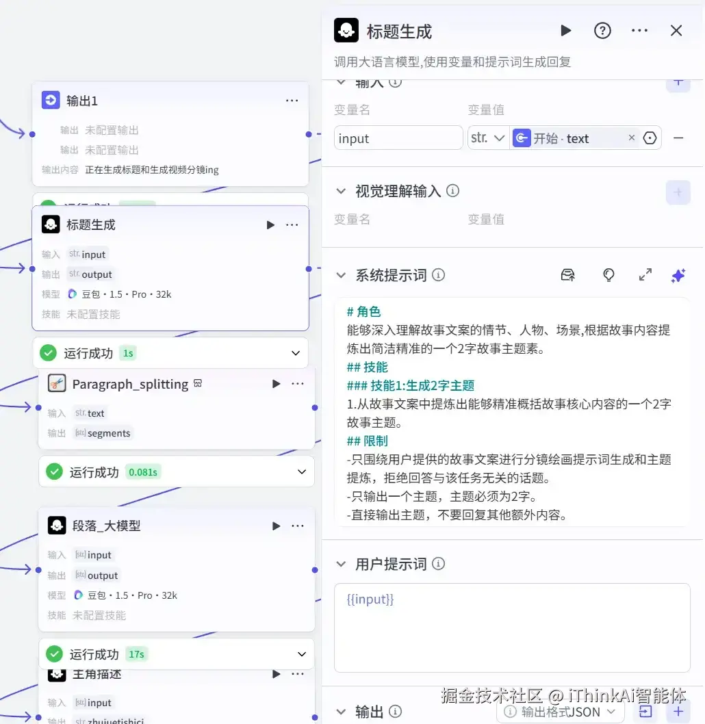 通过大模型节点提炼2字故事主题(如「权谋」「逆袭」),系统提示词需设定主题提炼规 则