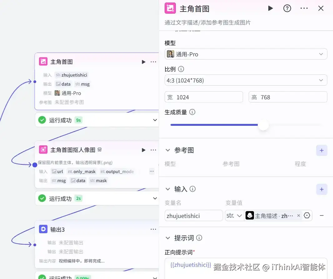 调用图像生成节点输出4:3比例主角图,使用cutcout节点实现透明背景