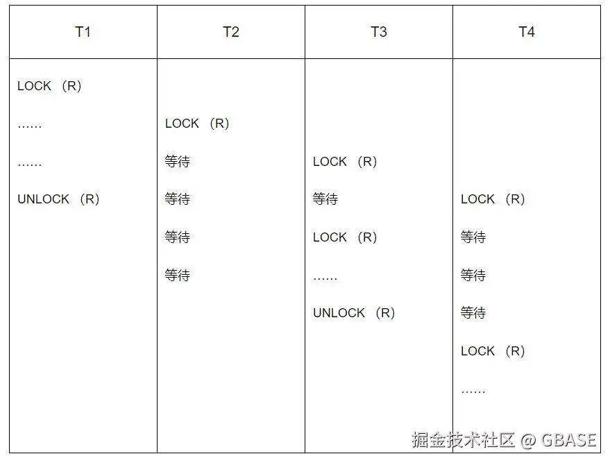 在处理并发事务的过程中,如果事务T1在数据对象R上加锁,事务T2又请求为数据对象R加锁,则 T2 必须等待T1释放加在R上的锁。如果事务 T3 也请求为 R加锁,当T1释放了R上的锁之后系统首先响应T3的请求,则允许T3对R加锁,此时 T2 仍需等待T3 释放加在R上的锁。然后事务T4又请求封锁R,当T3释放了R上的封锁之后系统 又响应了T4的请求……T2有可能永远等待而无法为R加锁,这就是活锁(Live lock)。