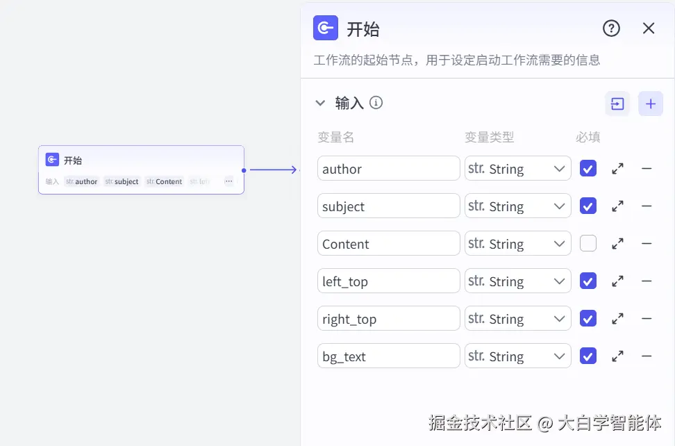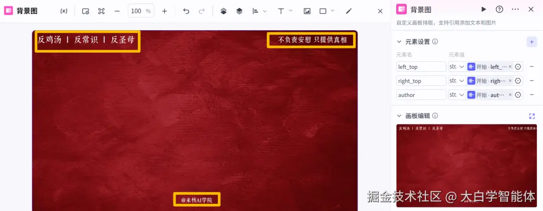 画板组件在图文工作流中生成封面比较多,在这里我们也用它来生成背景图片。如下图,该背景图的左上角、右上角、底部分别由开始节点的3个变量来替代。