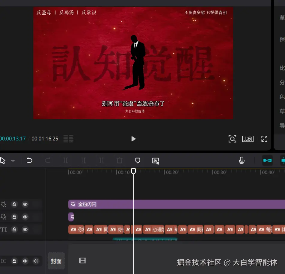 1.梳理视频构成: 这一步是肉眼感知工作流的构成,看一下视频的总体构成有哪些要素。这个视频中包含了分镜图片、红色背景图片、背景大字(认知觉醒)、字幕、字幕语音、背景音乐、特效(开头放大镜特效和整篇金粉闪闪特效),共7个部分组成。