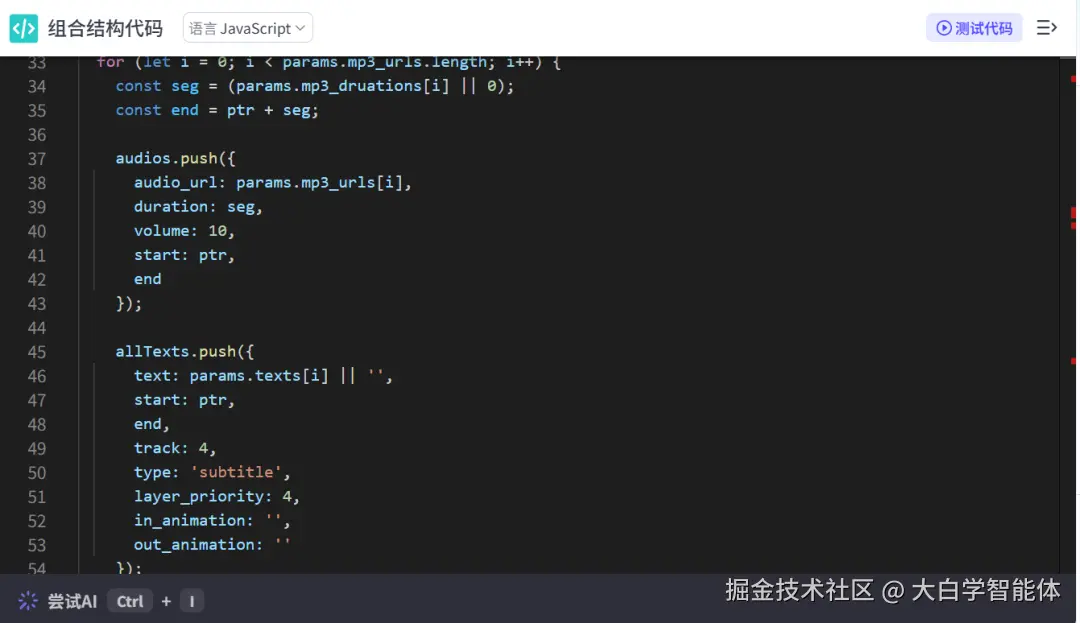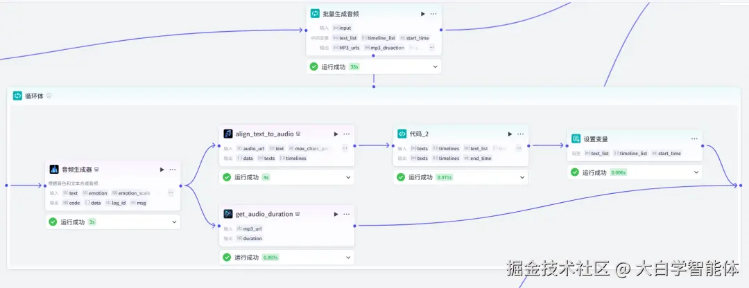 1)在批处理体里,把分割后的口播文案分别生成音频。并使用了【字幕音频对齐】插件align_text_to_audio,使字幕和音频的时间线保持一致。2)使用代码节点拼接所有的字幕,并计算出它对应的时间线。