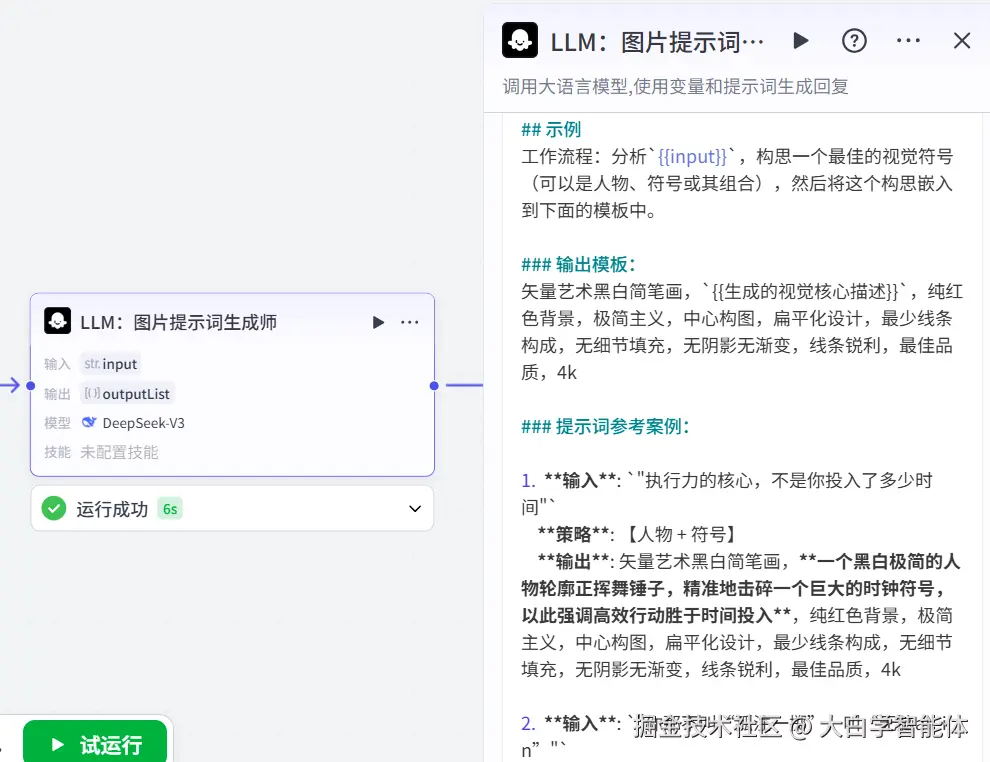 第三步的分镜文案分割后,大模型节点根据这些内容生成分镜绘画提示词。这里使用了大模型节点的批处理模式,可以让它并发完成任务,提高速度。