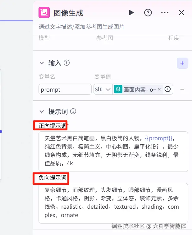 在【图像生成】节点指定模型用通用Pro,比例1:1,生成质量拉满。并指定了正向提示词和负向提示词。负向提示词就是不希望图片里出现的样式或内容。