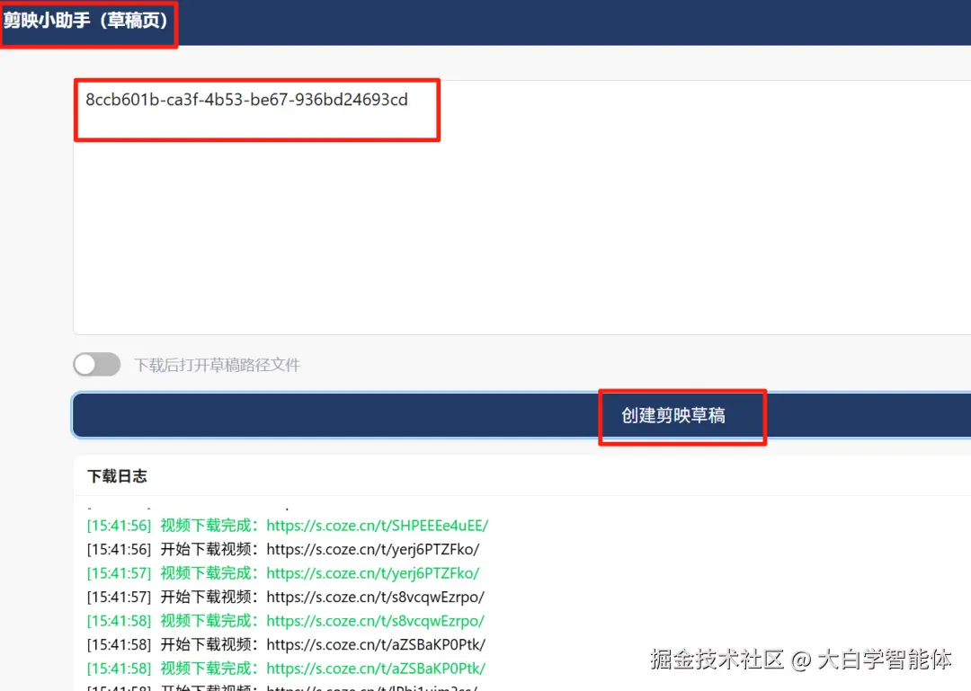 把生成后的草稿ID拷贝到下面的剪映小助手工具,点击创建剪映草稿,等待草稿下载完成。打开剪映工具,首页看到的一个黑乎乎的草稿就是新生成的视频啦~