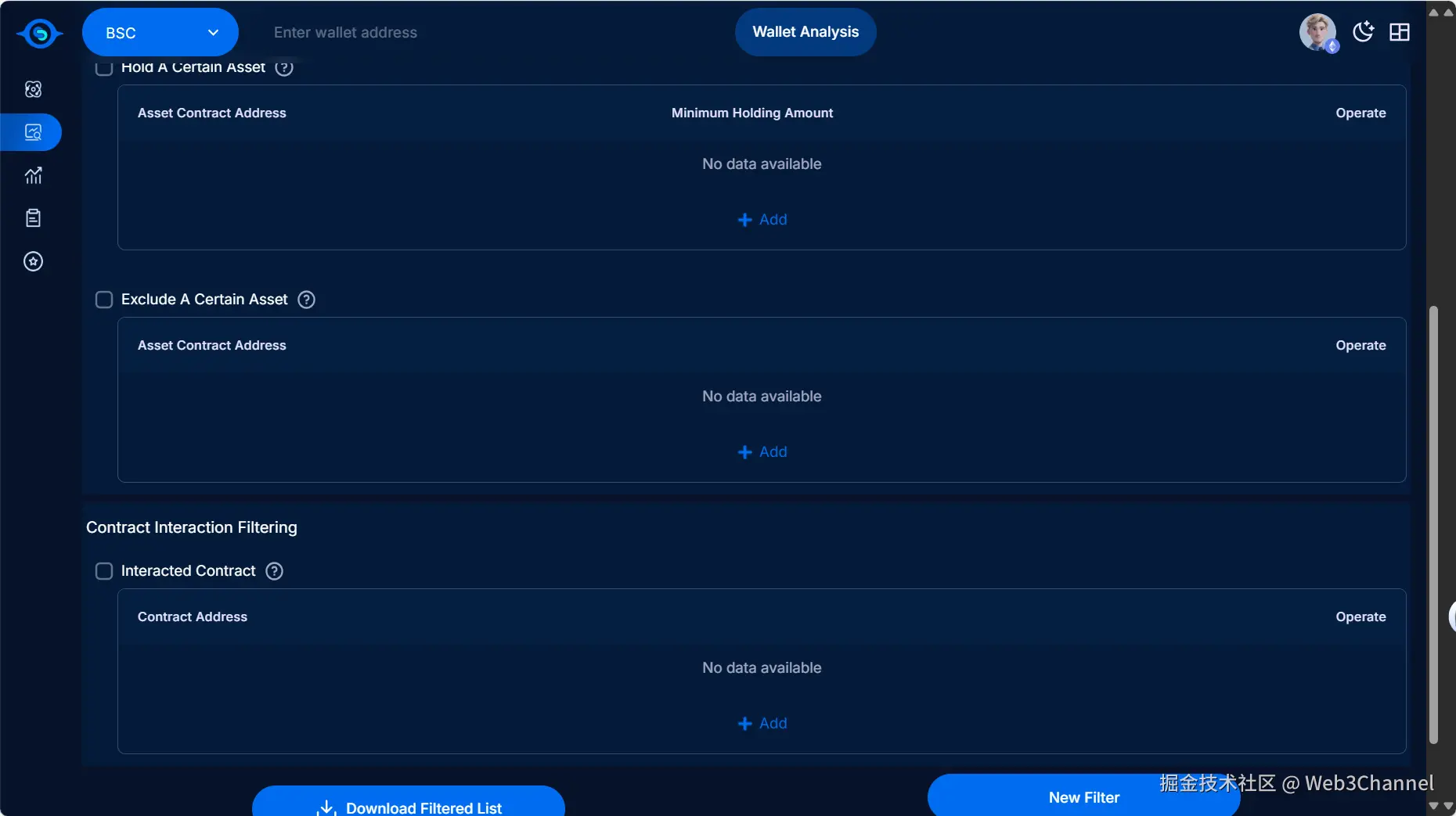 **Creditlink 支持用户一次性上传数百上千个钱包地址,并通过自定义条件(如区块链网络、钱包创建时间、余额下限、是否收过空投、是否与特定合约交互等)进行快速筛选。
