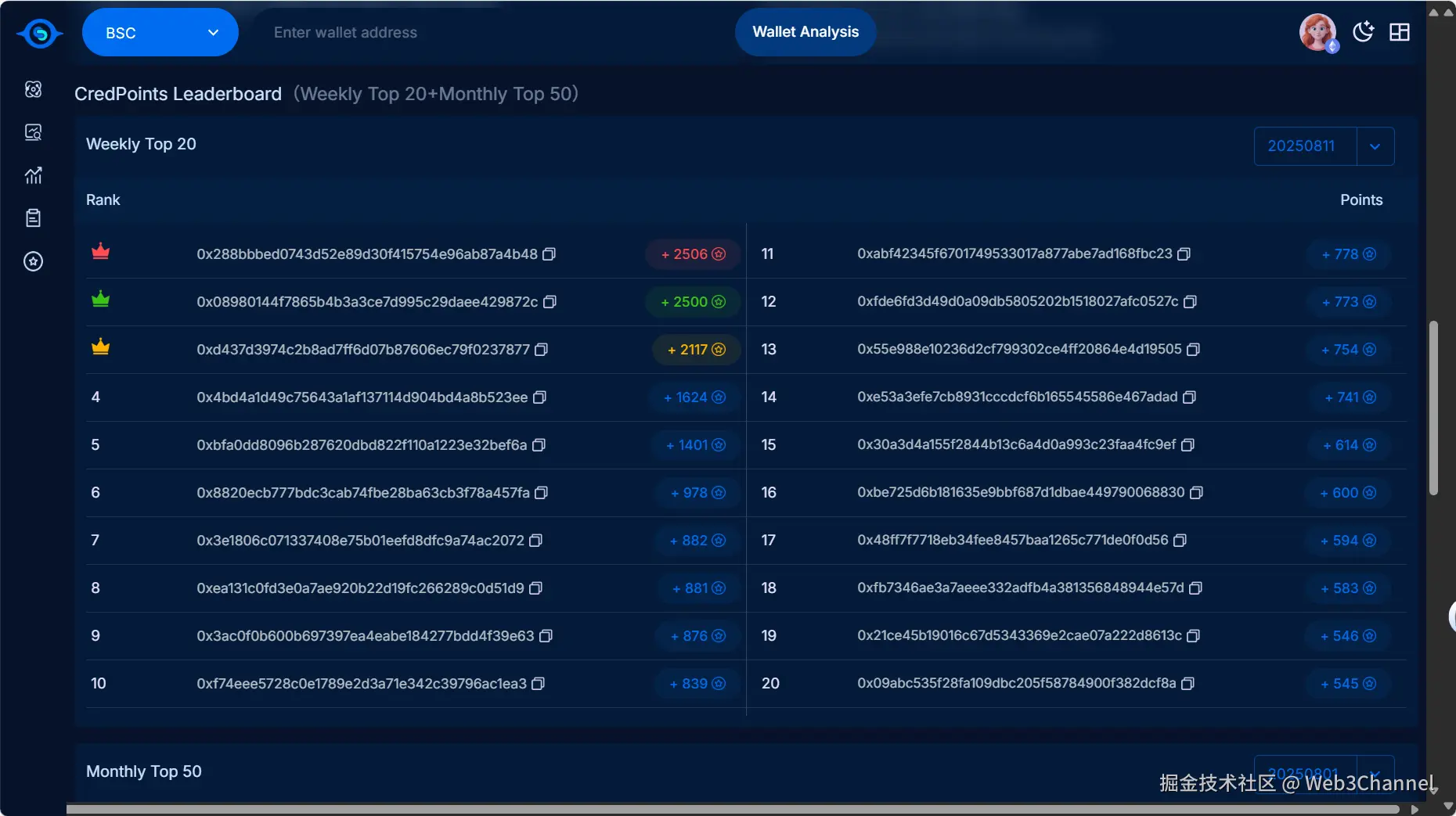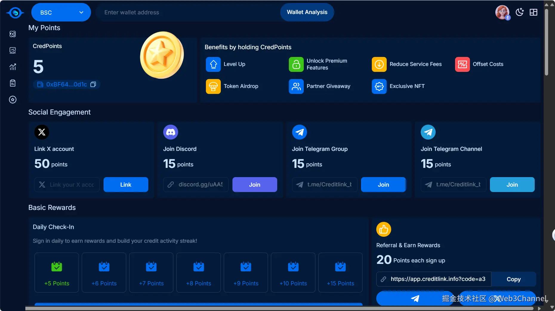 - 用户绑定钱包并完成指定任务(如代币分析、批量查询、社交账户绑定等)即可获得积分