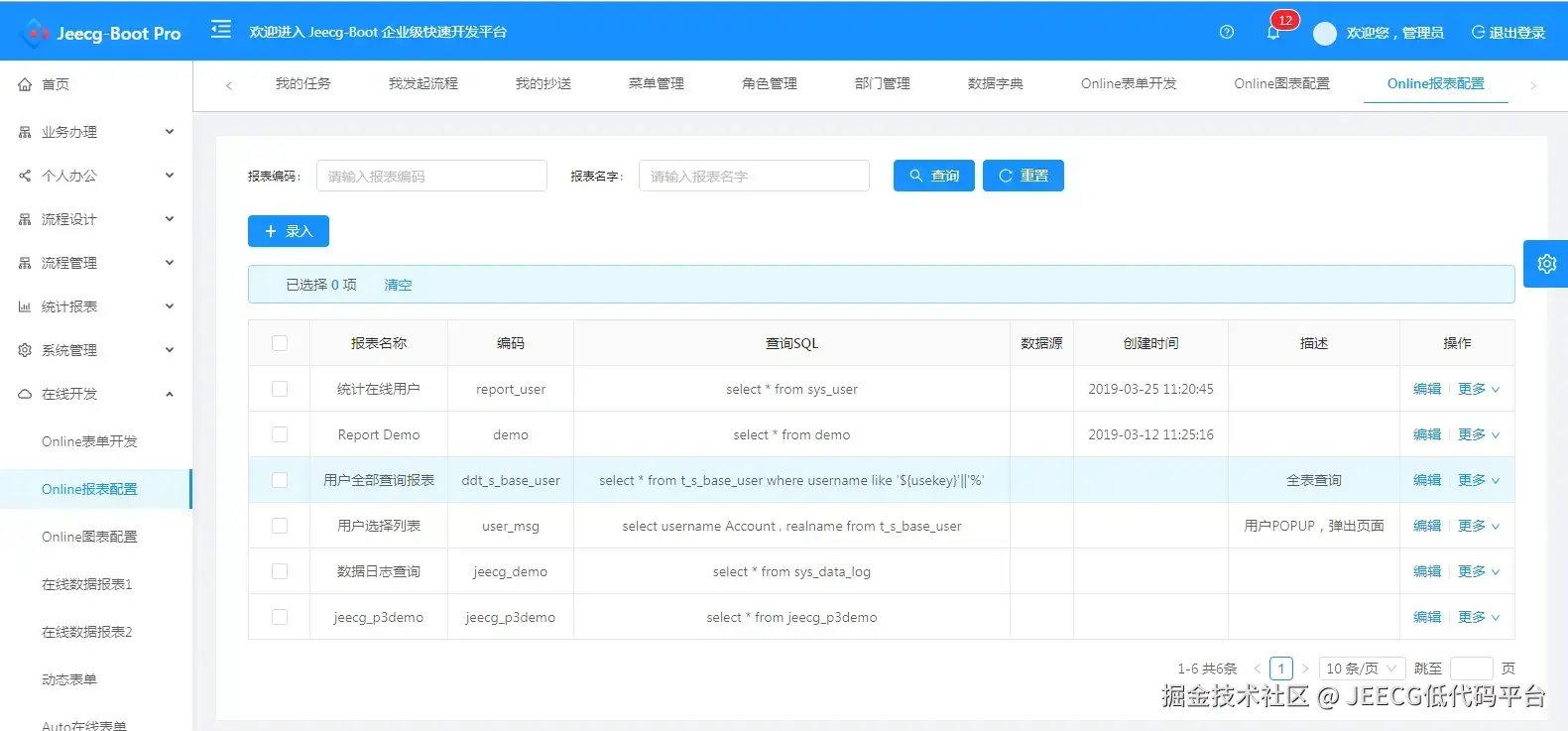 - 8.低代码能力:在线报表、在线图表(无需编码,通过在线配置方式,实现数据报表和图形报表,可以快速抽取数据,减轻开发压力,实现人人皆可编码)。
