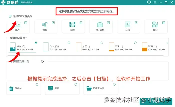 步骤1: 打开软件后在首页上选择需要恢复的文件类型,然后再选择需要扫描的位置,按下【扫描】的按钮让软件开始扫描;