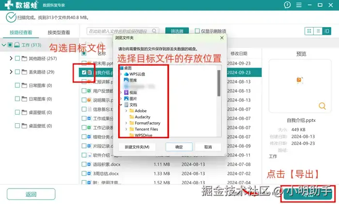 步骤2: 耐心等待软件的扫描工作结束后,在指定的位置上选择需要恢复的文件,按下【导出】,再选择存放文件的合适位置。