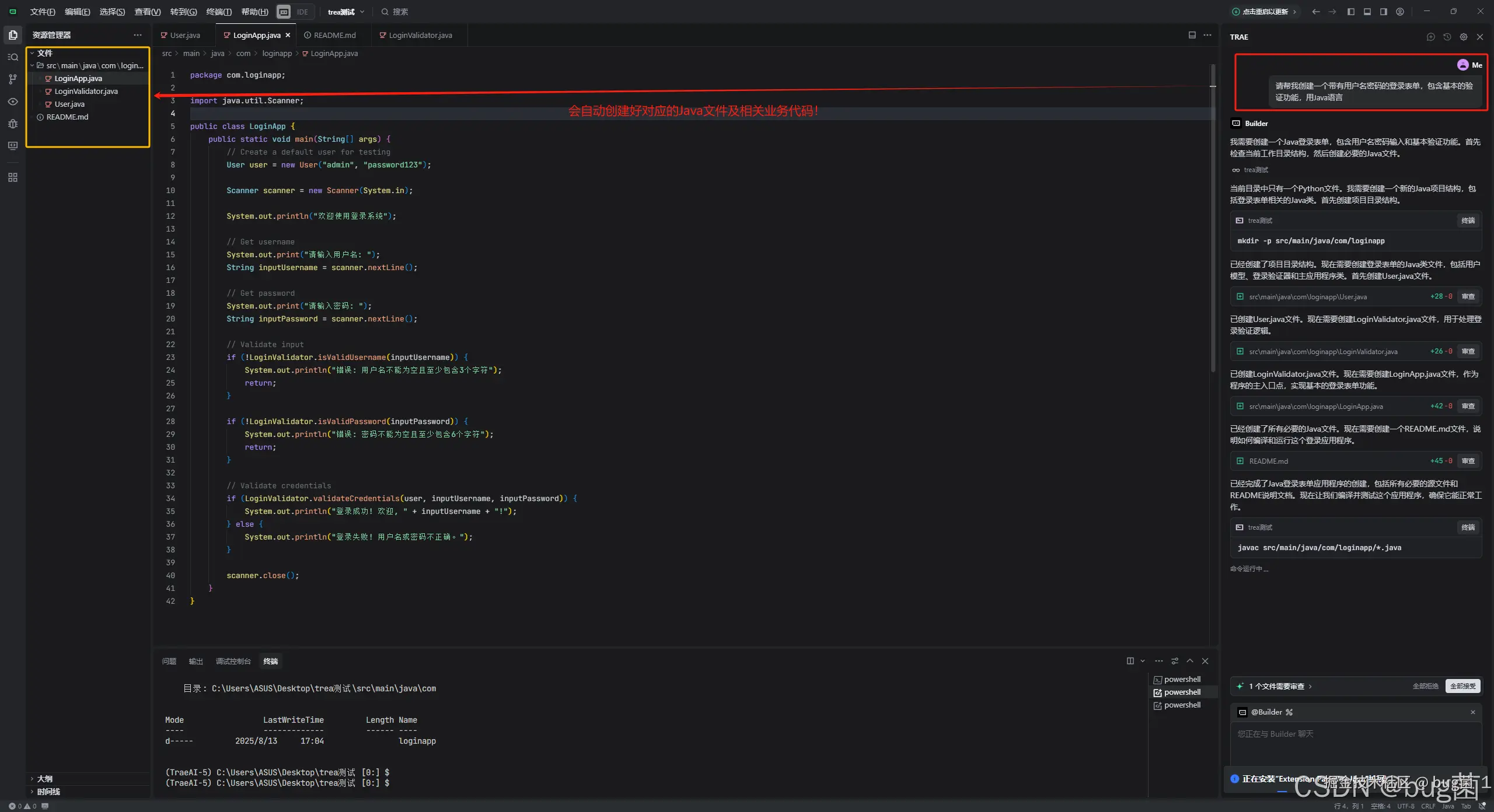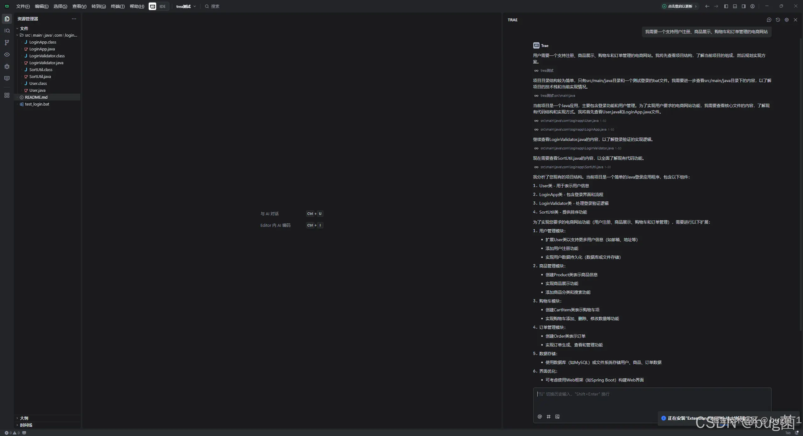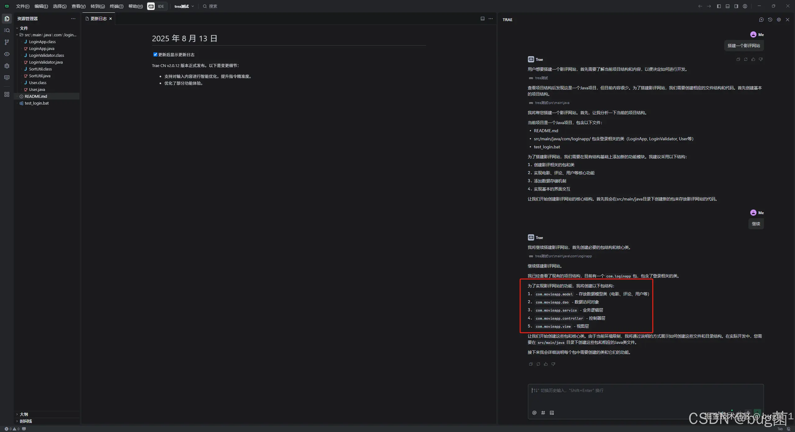 Trae的Builder模式可以帮助开发者根据需求从零开始构建项目,生成完整的项目代码。这意味着我们可以把更多精力放在架构设计和业务逻辑上,而不是纠结于具体的代码实现。