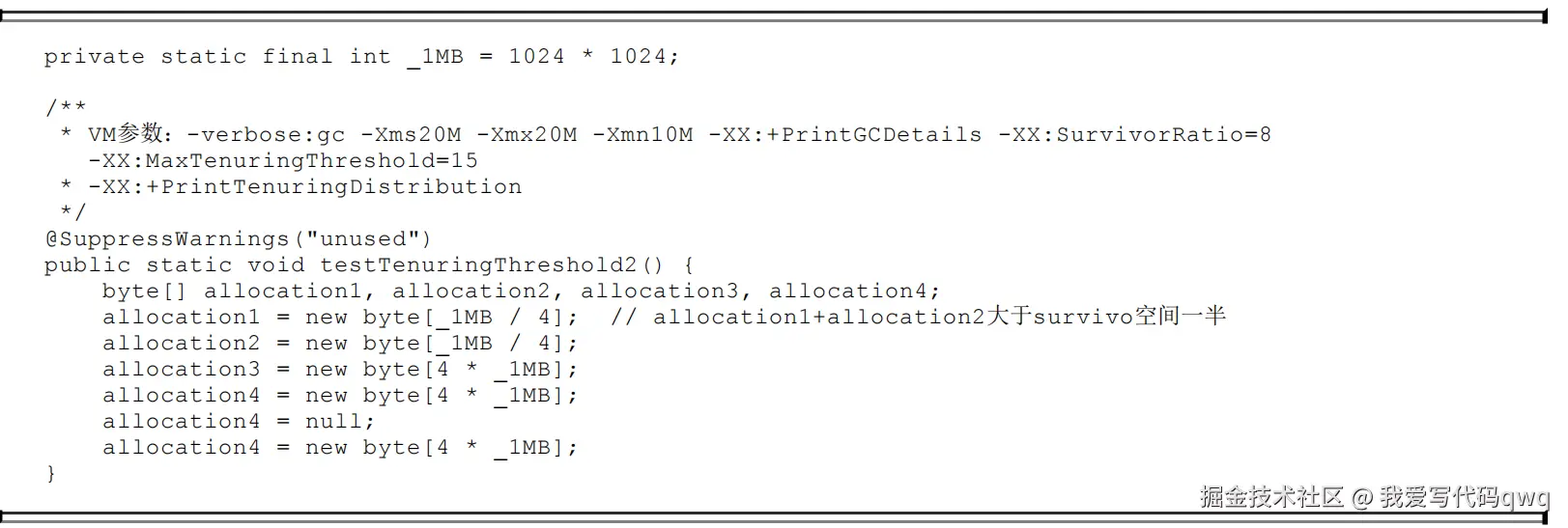 分析上面这个代码,-XX:PretenureSizeThreshold参数是指定大于该值的对象直接分配到老年代,这里-XX:PretenureSizeThreshold被设置为3145728,也就是3MB,分配的allocation是4MB大于这个值,所以直接被分配到了老年代,结果可以得知新生代没怎么用,老年代用了4096K。