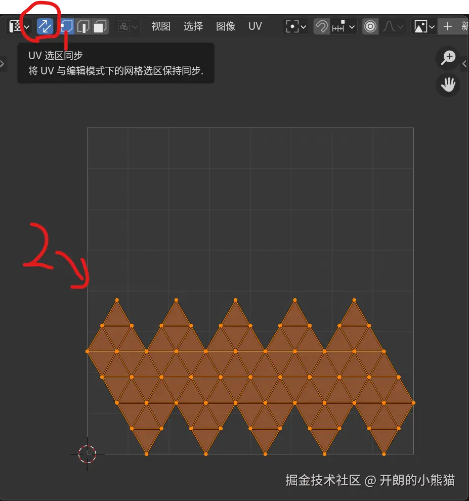 接下来,回到我们的3D视图,选中你的模型,按下Tab键,进入编辑模式,单击A选中所有面,回到UV编辑器界面,点击左上角UV选区同步(或者右键空白处,点击展开)即可展开简单图形的UV,如下图所示。