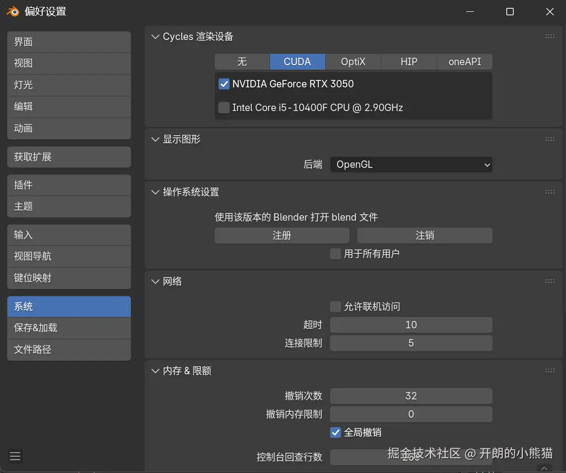 点击系统,在Cycles渲染设备处选择(none是cpu,cycles使用compute shader进行光追计算,支持cuda(AMD则是hip)的设备都可以跑,optix是nvidia的GPU光追sdk,如果硬件支持则用optix比单用cuda性能更好。如果硬件支持但看不到cuda或optix设备列表,则考虑去nvidia官网下载对应sdk)(总之N卡CUDA OptiX,A卡HIP)