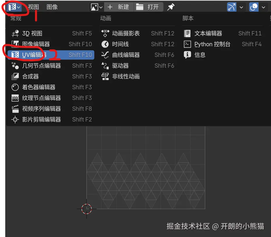 先拉出来一个窗口,点击左上角,更改为UV编辑器,如下图所示。