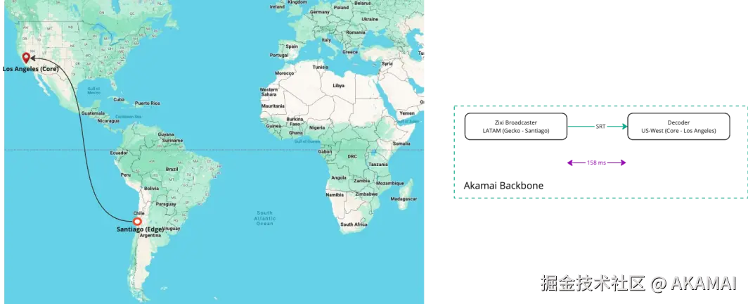 结果表明,Akamai分布式区域为南北美之间的长距离传输提供了低延迟表现。接近零丢包和极低抖动使流媒体获得100分的完美健康评分。