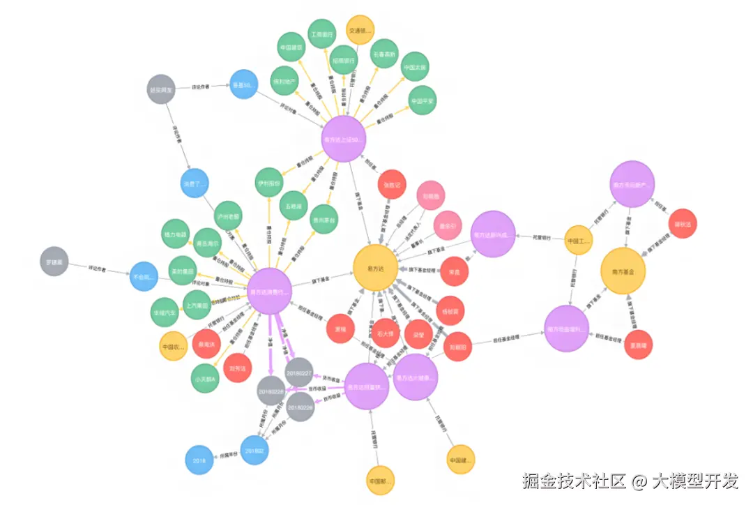 知识图谱由节点、边、属性组件构成:节点(实体和概念),代表现实世界或抽象概念中的实体,如个人、企业、事件等,以及更抽象的概念,如类别、属性等;边(关系),表示实体间的具体关系或属性,例如,“托管银行”、“管理基金”、“重仓持股”等,这些关系明确地定义了节点间如何相互关联;属性(特性),提供额外的描述信息,比如出生日期、所属年份等。