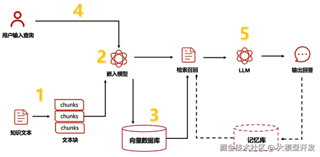当前, RAG 已经成为业内公认的大模型知识库关键技术路线最佳落地范式之一。RAG 为生成式大模型与外部信息交互提供了良好的解决方案。RAG 通常包括两个阶段:检索上下文相关信息和使用检索到的知识指导生成过程,其基本流程可以分为知识文本准备、文本切分转换、向量数据存储、问题理解及检索、生成问题解答,如下图所示: