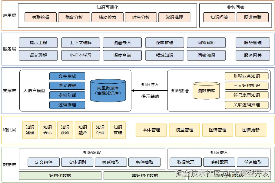 其中,数据层利用知识获取组件和知识接入组件处理结构化、半结构化和非结构化数据信息,形成三元组织数据基础;知识层对数据层处理的数据信息进行质量评估和知识融合,形成知识图谱管理;支撑层实现知识图谱信息对AI大模型知识库的知识注入和提示辅助支撑,提升大模型可解释性和关联推理能力;服务层在对数据和知识进行运维和管理的基础上,面向交互问答应用封装模型及知识图谱服务接口;应用层则是利用大模型和知识图谱封装的服务能力来支撑知识可视化及业务问答应用,如说关联挖掘分析和业务知识问答。