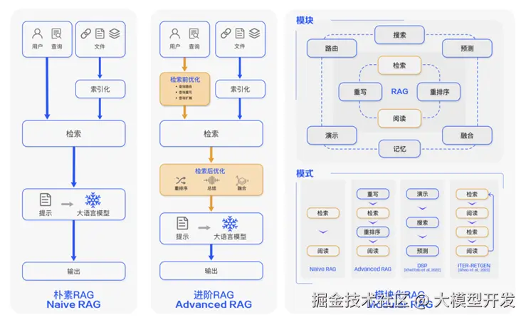 RAG概念最早由Facebook提出,但受限于当时语言模型的能力,并未引发更多的关注。在大模型性能取得巨大进展的同时,伴随而来的幻觉问题使 RAG 技术重新进入人们的视野。在 RAG 技术发展过程中,从技术范式角度,将其总结为朴素 RAG 、进阶 RAG 和模块化 RAG 3个阶段,如下图所示: