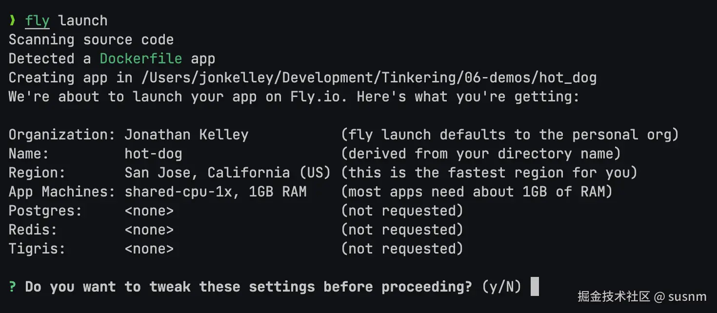 现在我们执行 fly launch 命令,这将自动初始化我们的 fly.toml 文件。