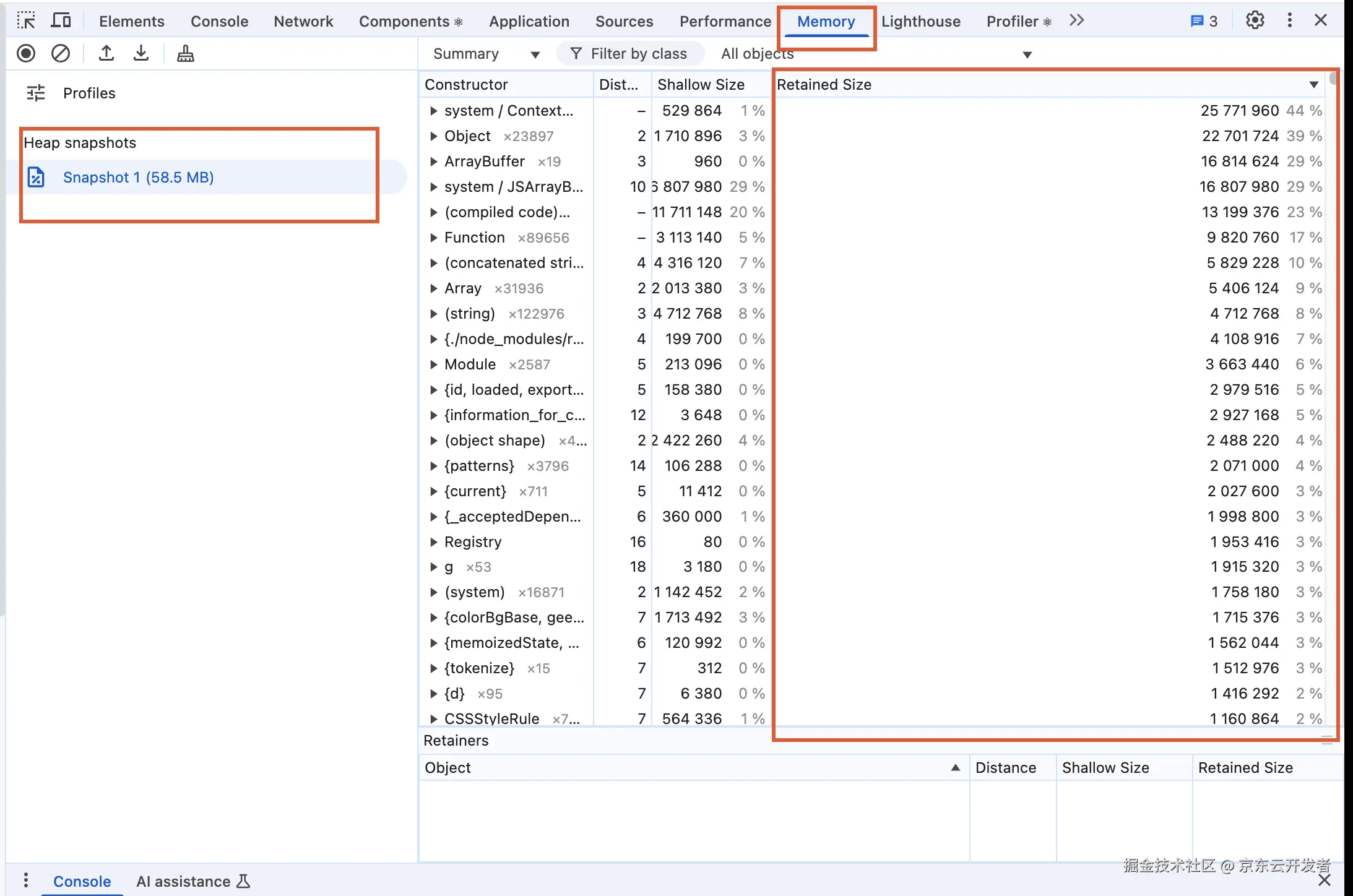 - 检查 Retainers(持有者),找到导致内存泄漏的代码。