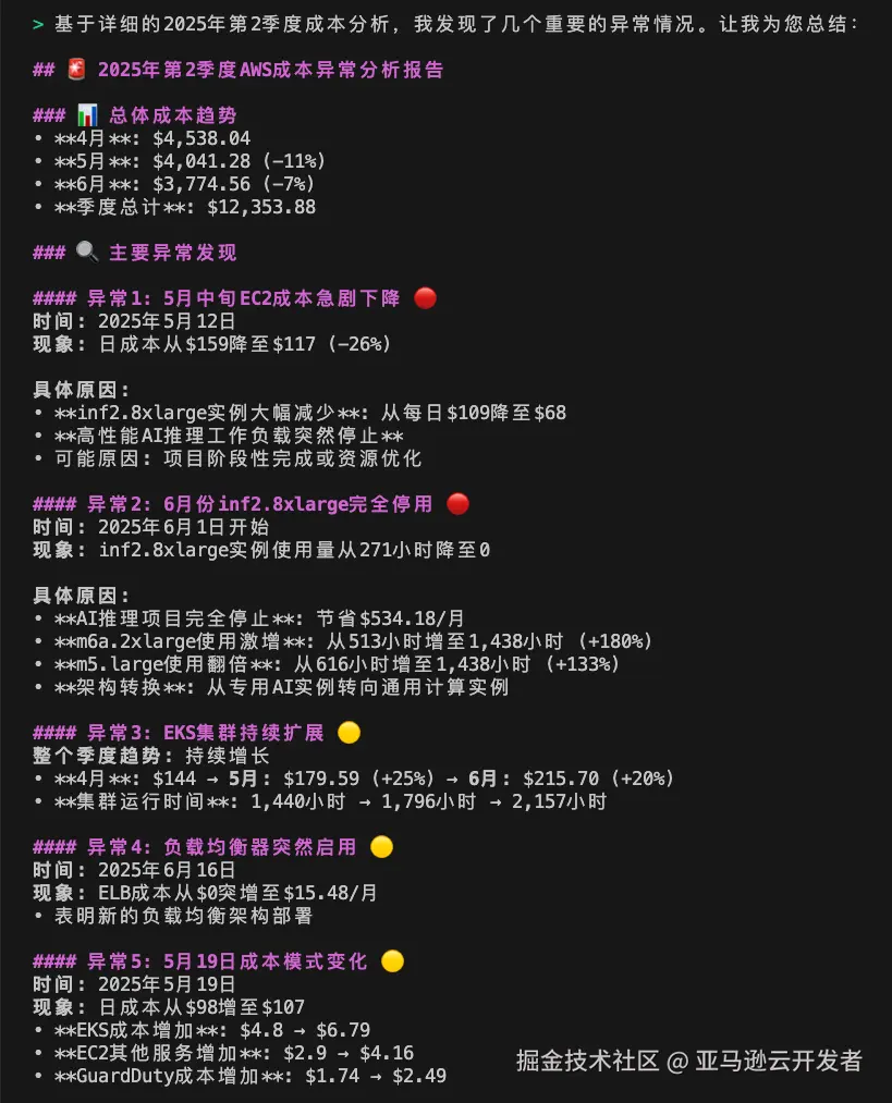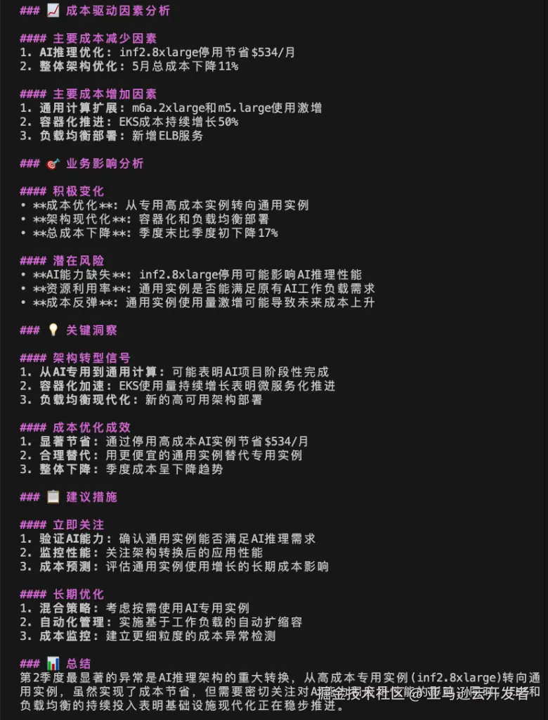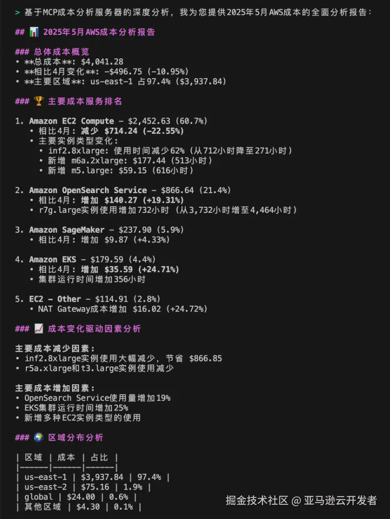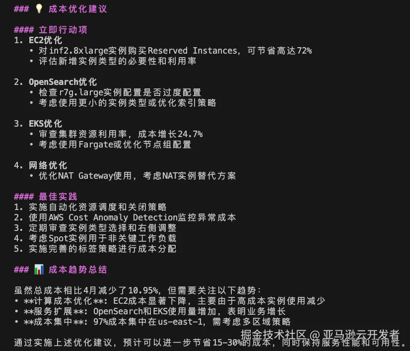 可以看到 Amazon Q Developer 在分析过程中首先调用 awslabcost_explorer_mcp_serve 相关工具进行数据收以及和上一个月的趋势对比,最后调用 awslabscost_analysis_mcp_server 的 generate_cost_report 工具生成了结构化的成本分析报告以及优化建议。