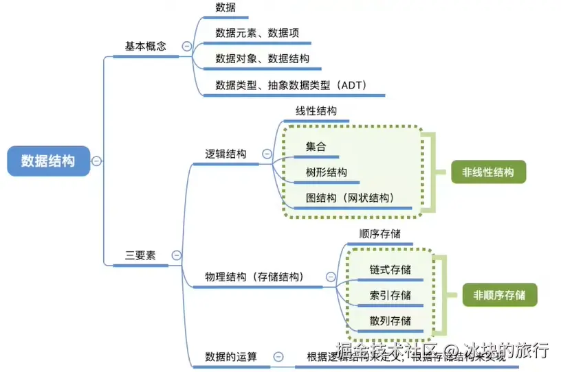 - 数据结构:数据结构是相互之间存在一种或多种特定关系的数据元素的集合。