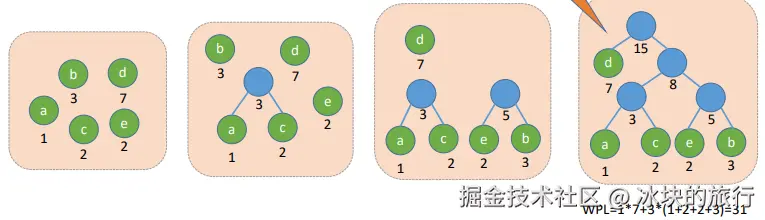 - 理论基础:每个初始归并段对应一个叶子结点,把归并段的块数作为叶子的权值,归并树的WPL= 树中所有叶结点的带权路径长度之和。归并过程中的磁盘I/O次数 = 归并树的WPL* 2。