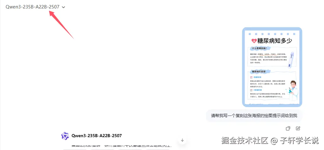 丢进qwen当中,选择qwen235b的那个模型,然后输入提示词,让它识别图片并拆解为设计提示词:
