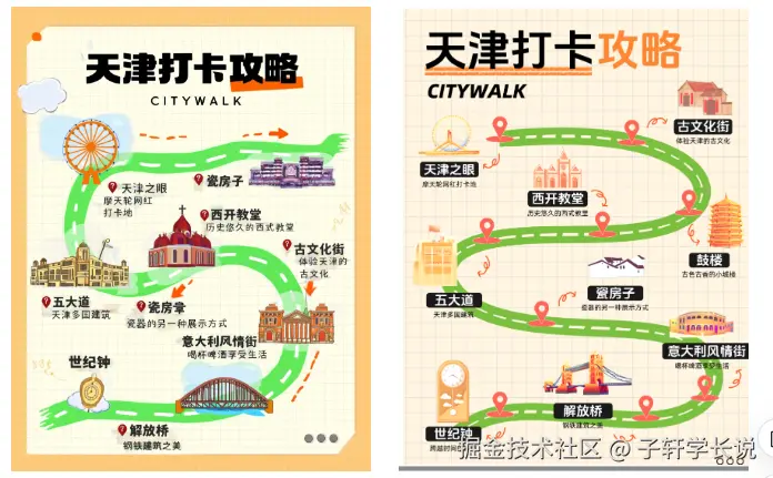 可以看看第一个天津旅游攻略海报的模仿效果:
