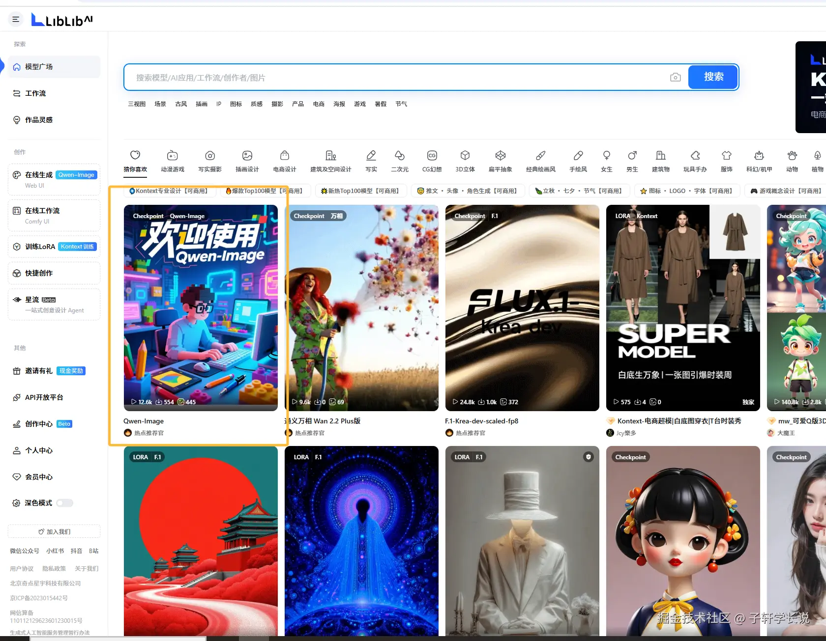 然后复制提示词,接下来需要使用qwen-image模型,但是开源的安装到本地还是挺难的,所以可以使用liblibai这个在线平台,已经上线了qwen-imge模型可以直接用。