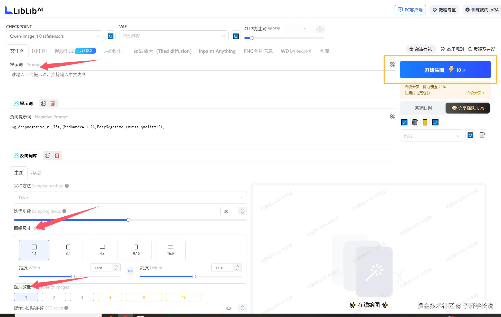 然后点击右侧的立即生图,来到设置参数的页面,也很简单,不复杂,第一个箭头的地方把提示词粘贴进来,第二个箭头设置比例,第三个箭头控制一次性生成图片数量。