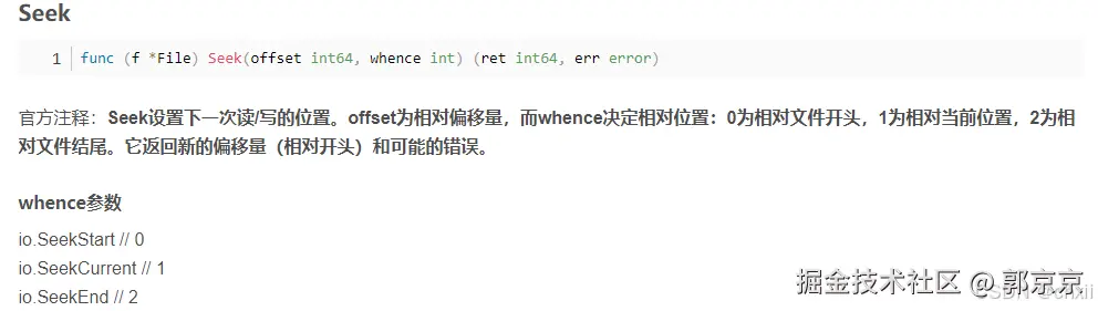 start, err := f.Seek(24, io.SeekStart) //从文件开头偏移24个位置