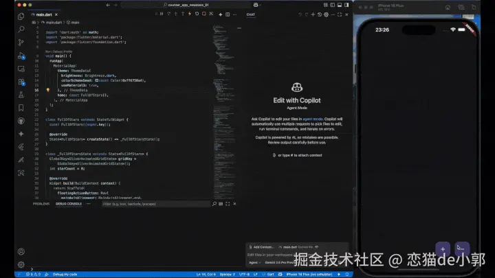 - 修复运行时错误 :检查实时 Widget 树,识别 Flutter RenderFlex 溢出,并自动应用正确的修复