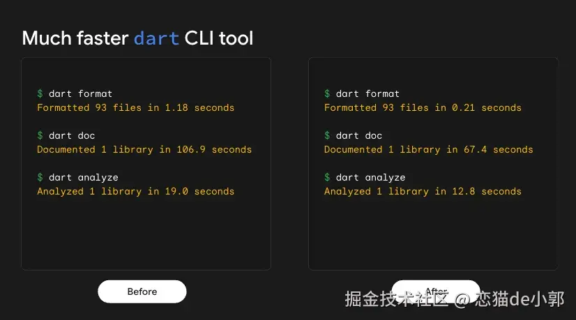 使用 Analysis Server 的 dart 命令行工具,现在运行 AOT 编译的 Analysis Server 快照,这些命令包括 dart analyze 、 dart fix 和 dart language-server 。