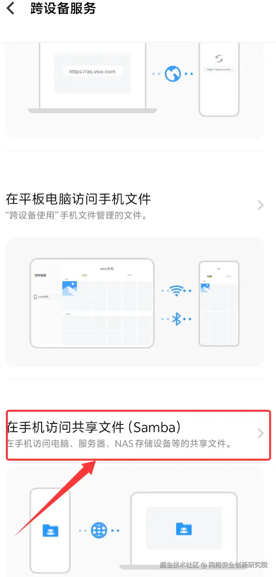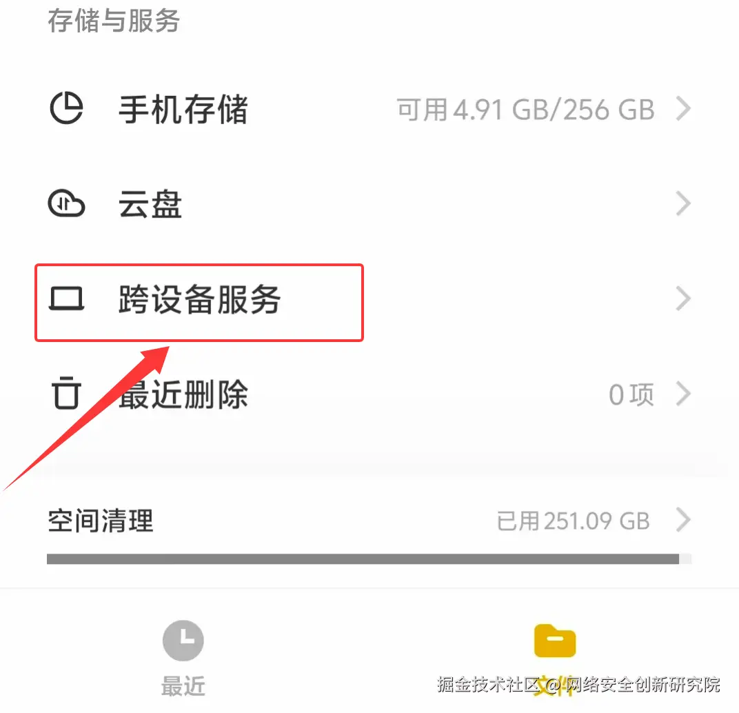 接下来,打开手机上的文件管理应用,根据实际情况查找与网络共享相关的功能入口(不同手机可能名称不同),点击"跨设备服务"。