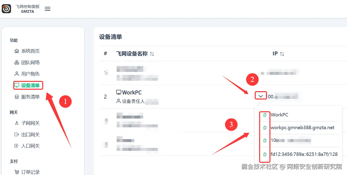 打开飞网控制面板,选择“设备清单”,进入页面后,点击小三角图标,将依次显示设备名称/域名/IPV4/IPV6,点击其对应的“复制图标”即可复制成功。