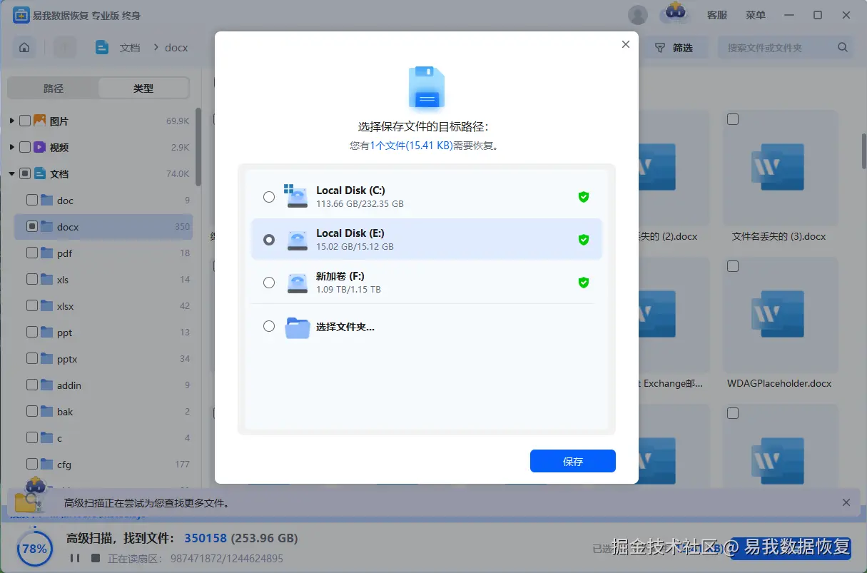 3.找到需要的微信聊天文件后点击恢复,并选择保存的位置,切记不要保存到源盘,避免数据被覆盖。