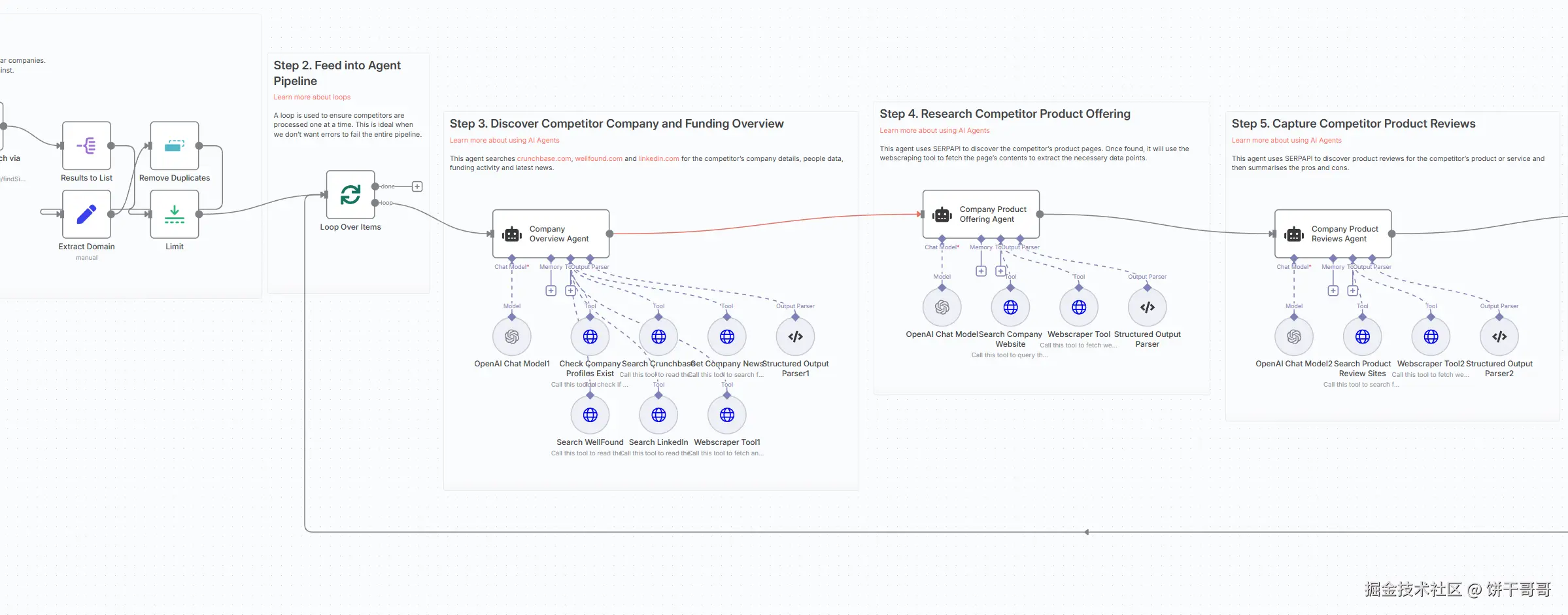 - 输入一个公司名,工作流会用Exa.ai找到竞品,再用多Agent 分头研究,最后将报告自动整理进Notion。