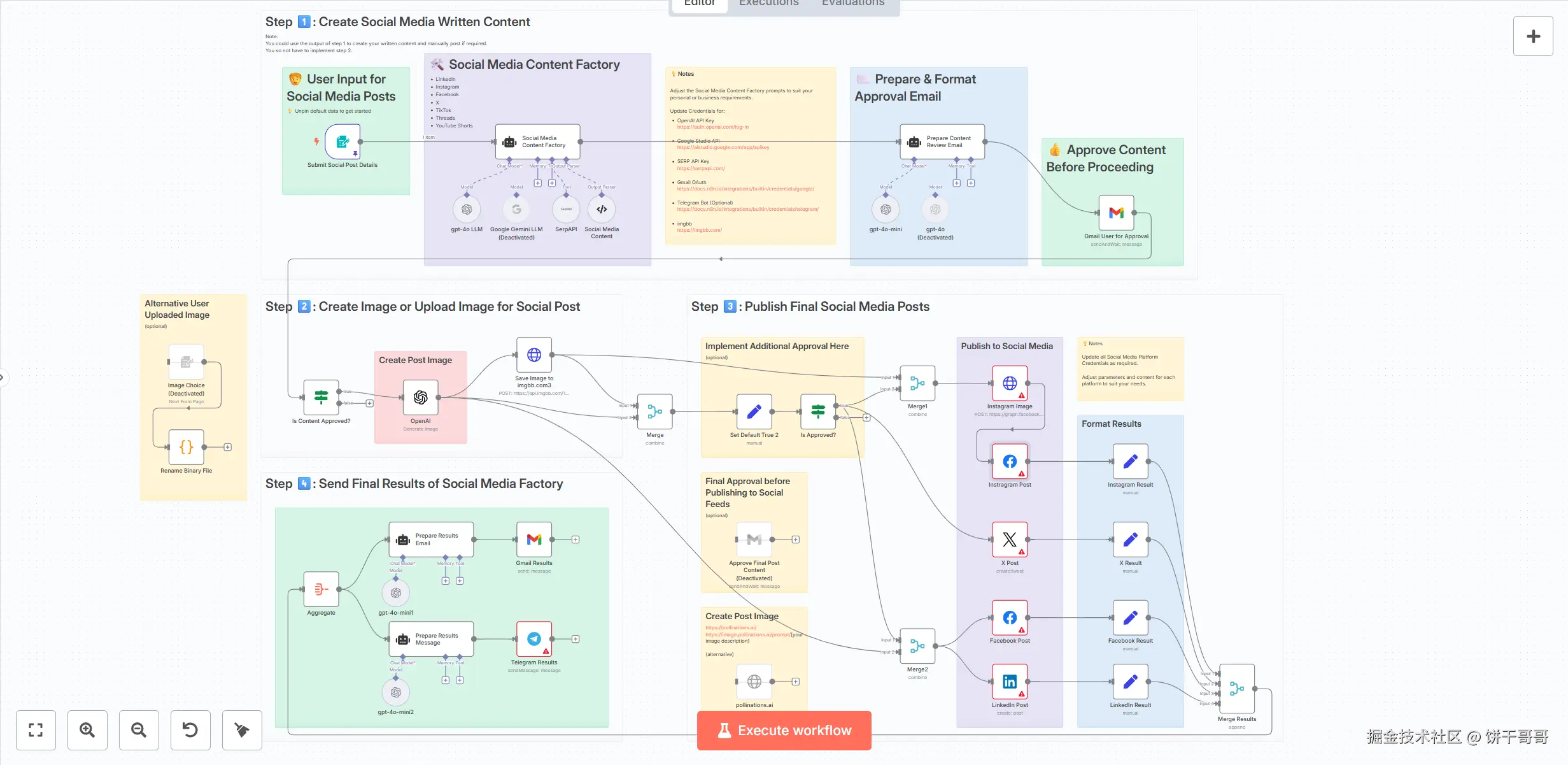 从Google Sheet提取创意后,由OpenAI生成帖子草稿,再通过一封带审批按钮的邮件交由人工审核,实现发布流程的半自动化。