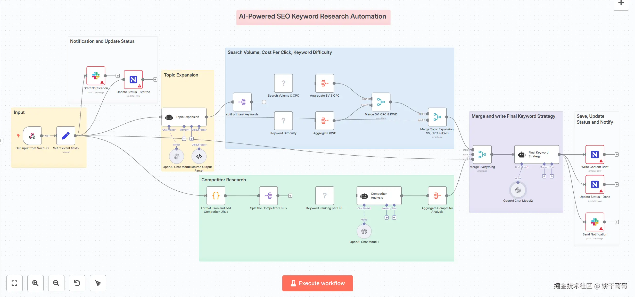 - 将一个核心主题交由OpenAI扩展成长尾词和问题,再用DataForSEO获取搜索量和难度数据,最后由AI综合分析并生成包含竞品洞察的完整策略。