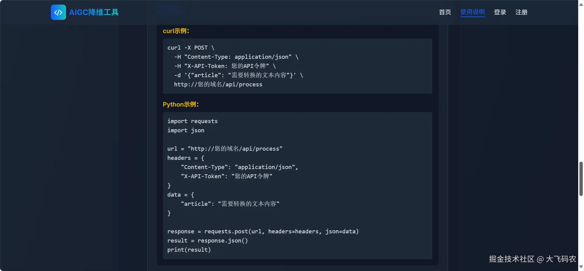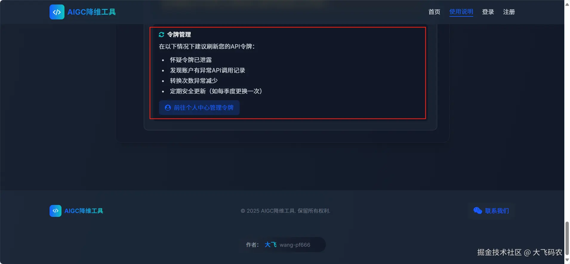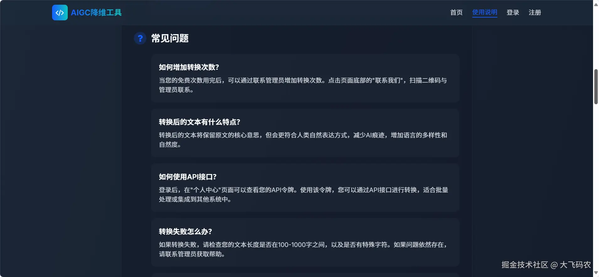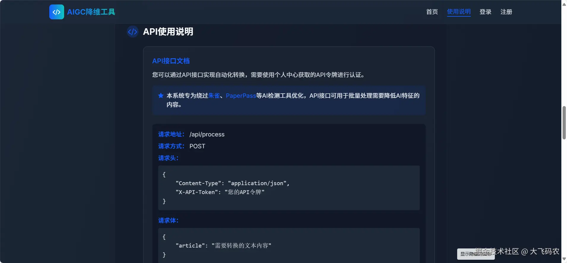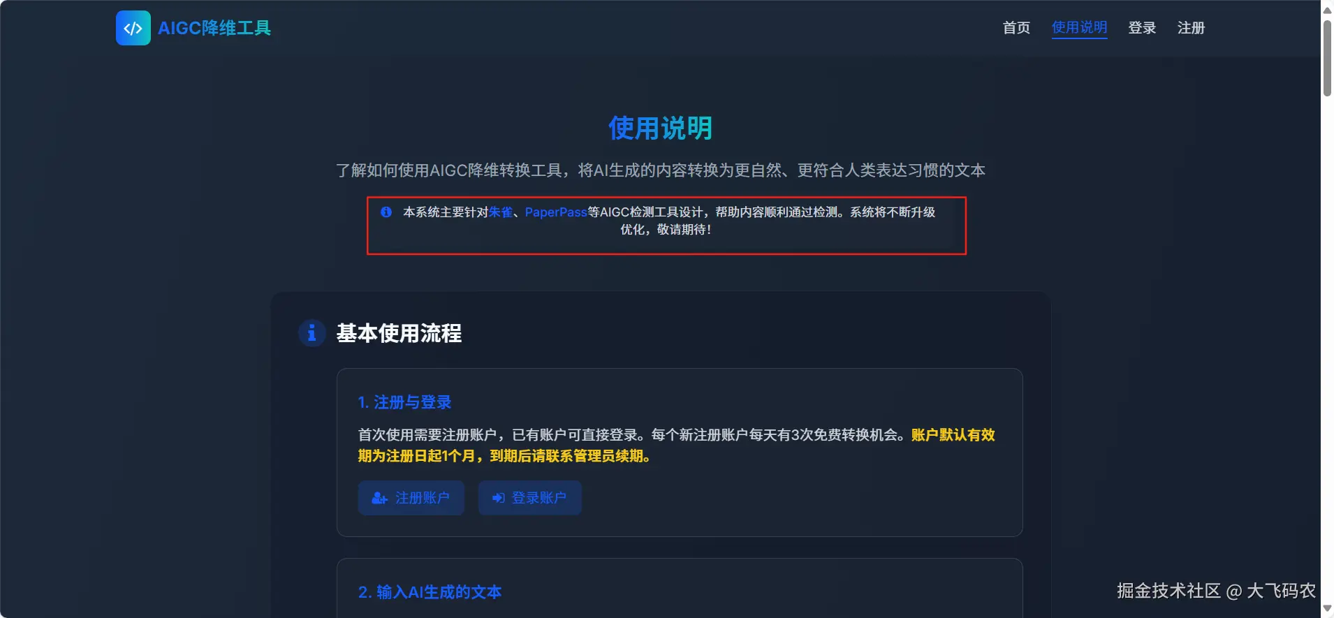 我们先看使用说明:这个工具主要是转换AI生成的文章,更加符合人的思维和表达方式,以达到完美通过AIGC检测,不是以前那种改改标点符号的取巧办法。