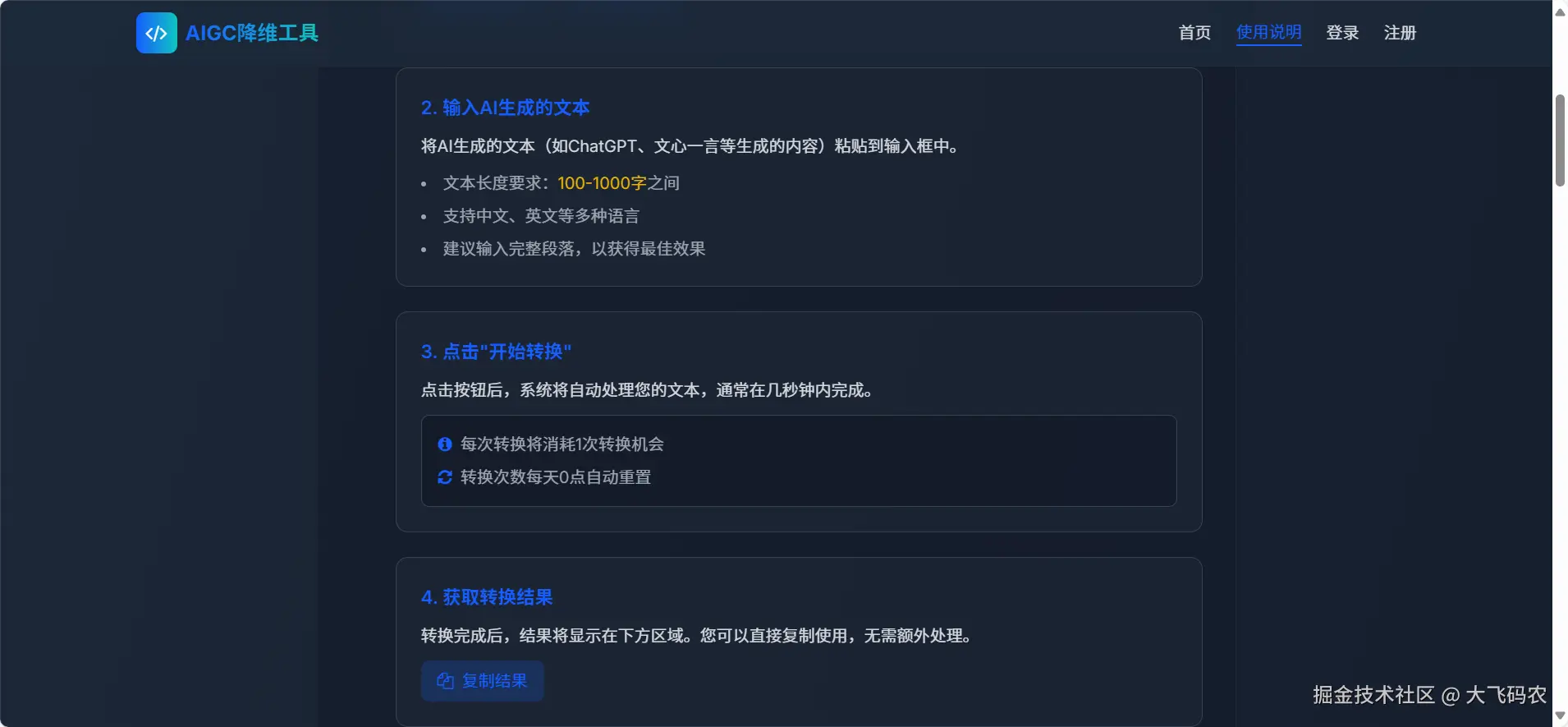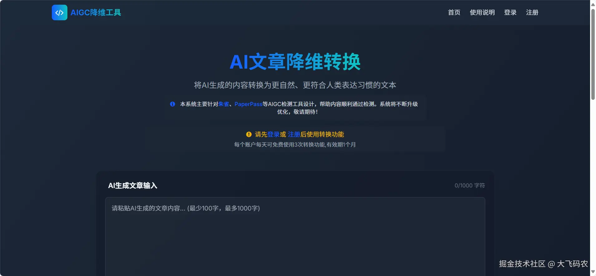 这里要声明一下,由于这个工具需要消耗我自己的大模型token数,所以每位用户每天只能免费试使用3词,每次最多不超过1000字。