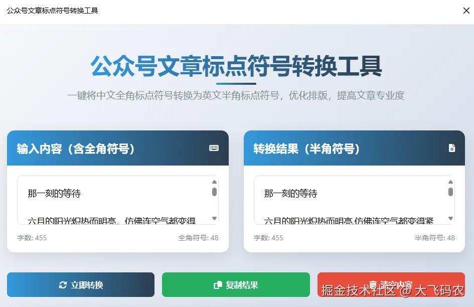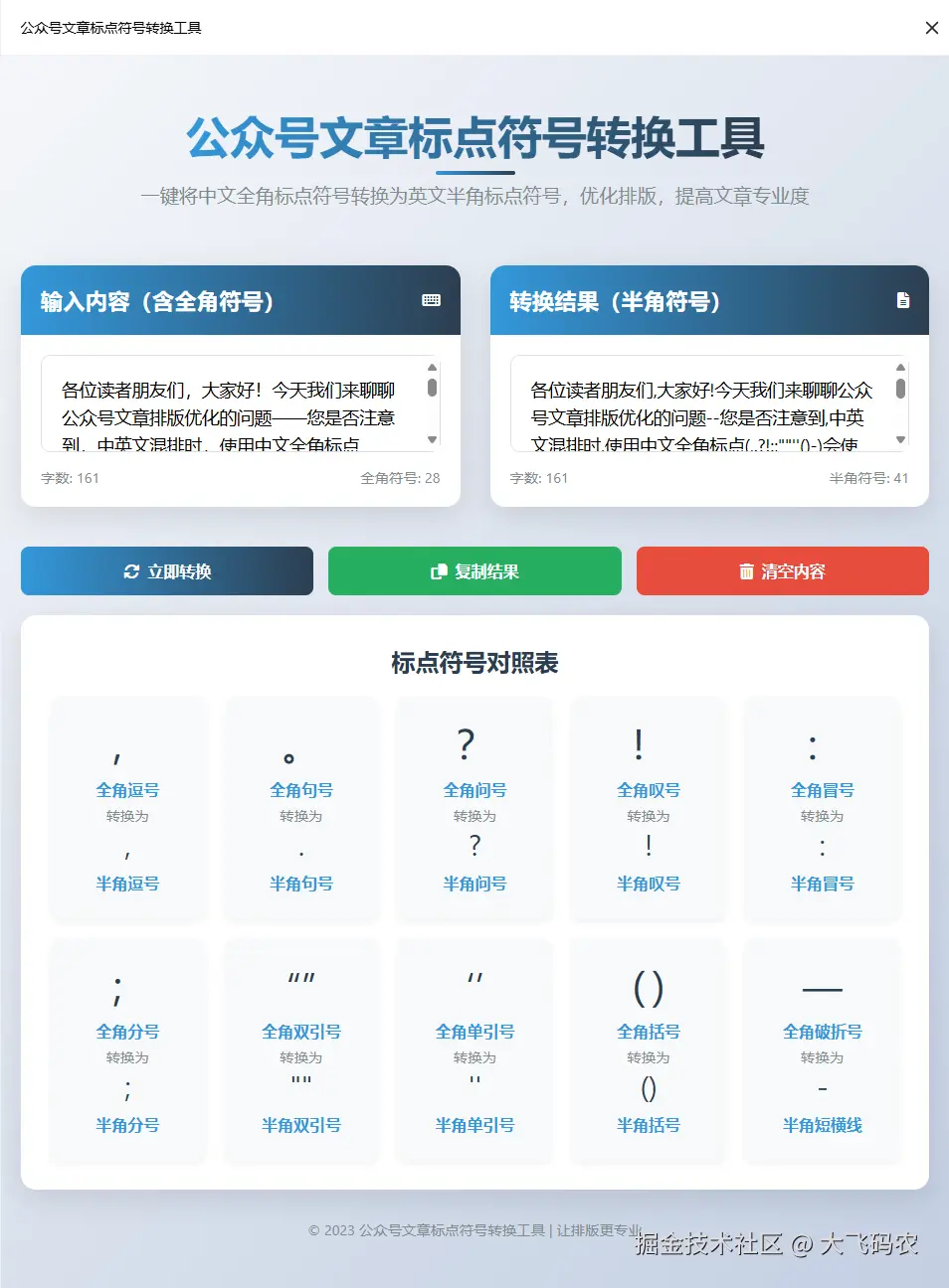 我要开发一个能将公众号文章内容里面中文全角标点符号,修改为英文半角标点符号的WEB转换工具应用。半角符号:, . ? ! : ; " ' ( ) -