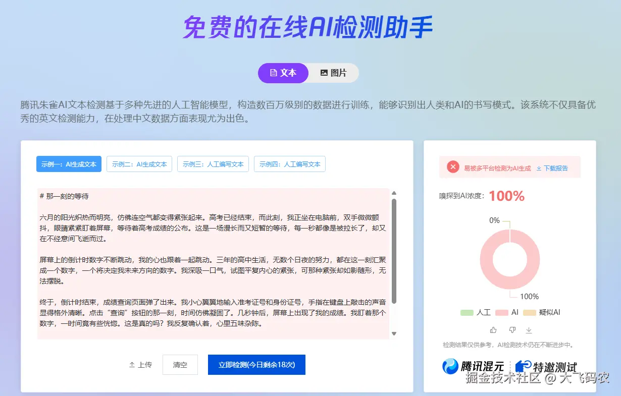 朱雀作为腾讯官方推出的ai检测工具,网上流传着一个很火的小技巧,据说可以让朱雀AI检测结果从100%降到0%!今天我来实测一下。