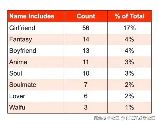 根据 Appfigures 的数据,最受欢迎的 AI 伴侣应用是那些寻找 AI 女友的用户使用的。在目前市场上的活跃应用中,17%的应用名称包含「girlfriend」(女友)一词,相比之下,包含「boyfriend」(男友)或「fantasy」(幻想)的仅占 4%。而「anime」(动漫)、「soulmate」(灵魂伴侣)和「lover」(恋人)等词语则更少被提及。
