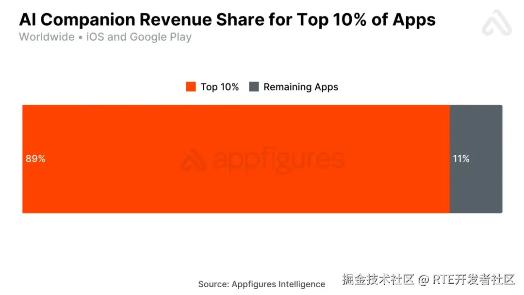 数据显示,排名前 10%的 AI 陪伴应用占据了该类别 89%的收入,约 10%的应用终身消费者支出已超过 100 万美元。每次下载的收入价值也显著提升,从 2024 年的 0.52 美元增至 2025 年的 1.18 美元,增幅达 0.66 美元。