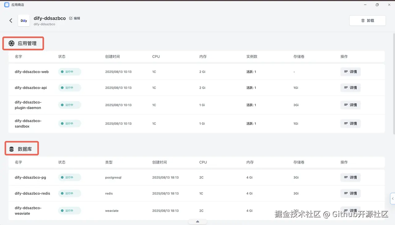 点击 Dify 的卡片,进入应用详情页。在这里,你不需要关心它背后需要多少个数据库和服务,Sealos 已经为你把这一切都打包好了。